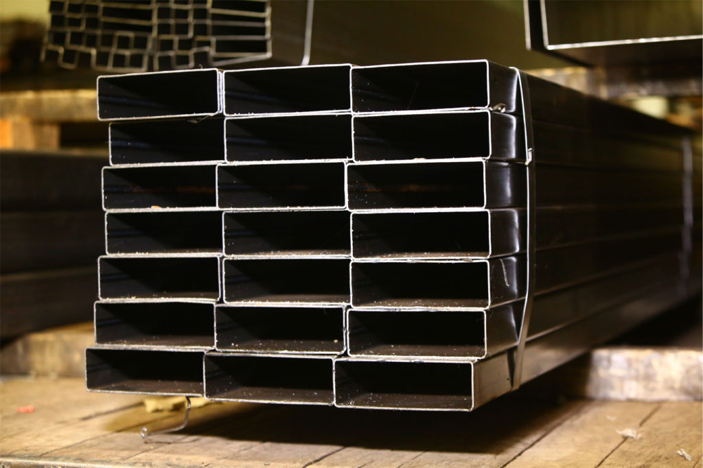 Tubo retangular com costura, medidas externas, produzido em aço carbono SAE 1006 a 1012 na chapa fina frio e fina quante, tendo opção com a costura interna removida.